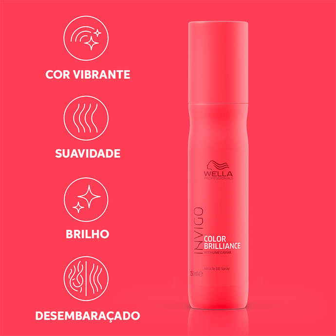 INVIGO COLOR BRILLIANCE Spray BB Leave-in balm enaltece o brilho da cor. Para cores vibrantes, fios desembaraçados e macios. Contém uma poderosa combinação de novos ingredientes para manter a vibração da cor e proteger o cabelo colorido. As moléculas encapsuladas de cobre mantem a vibração. A Histidina e a Vitamina E ajudam a controlar o processo oxidação apos o processo de coloração e ajudam a proteger a cor (Anti-Oxidant Shield Technology). O caviar de lima é conhecido por conter varias vitaminas e anti-oxidantes.