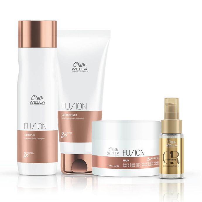 Kit com shampoo, condicionador, máscara capilar e óleo. O Kit Wella Professionals Fusion realiza uma limpeza saudável, que não compromete a saúde da fibra capilar, além de deixar os fios mais suaves, soltos e desembaraçados.